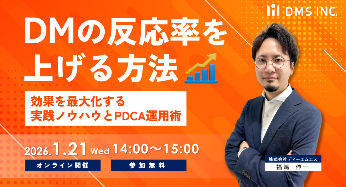2025.12.18 【2026/1/21(水)セミナー開催】 「DMの反応率を上げる方法~効果を最大化する実践ノウハウとPDCA運用術~」 このたび、株式会社ディーエムエスは、「DMの反応率を上げる方法~効果を最大化する実践ノウハウとPDCA運用術~」と題したセミナーを開催いたします。本セミナーでは、DMの反応率を上げるために今すぐ活用できる改善ノウハウから、効果を“見える化”してPDCAを回すためのポイントまでを分かりやすく解説いたします。参加無料、所要時間は1時間程度ですので、お気軽にご参加ください。※本セミナーは、Zoom配信によるオンラインで開催します。 BACK TO LIST